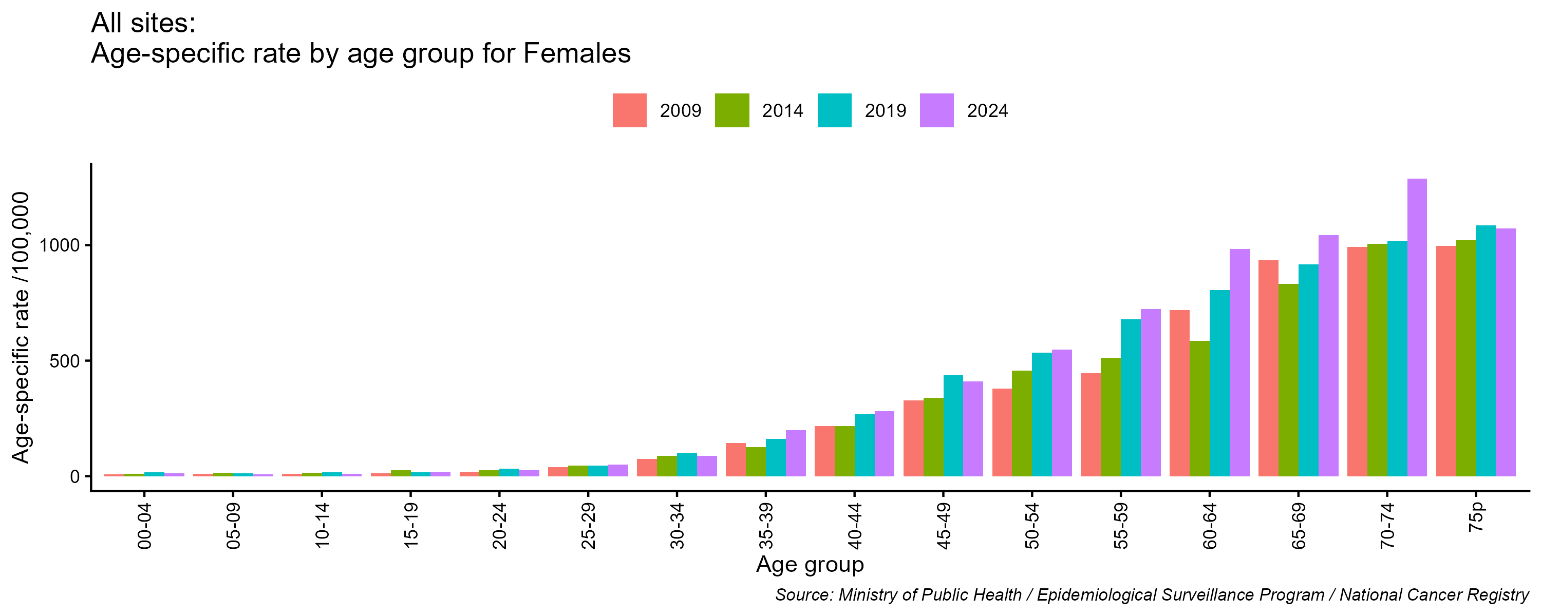 - All cancer age-specific incidence rates, including non-melanoma skin cancer, females, Lebanon, 2009, 2014, 2019, 2024