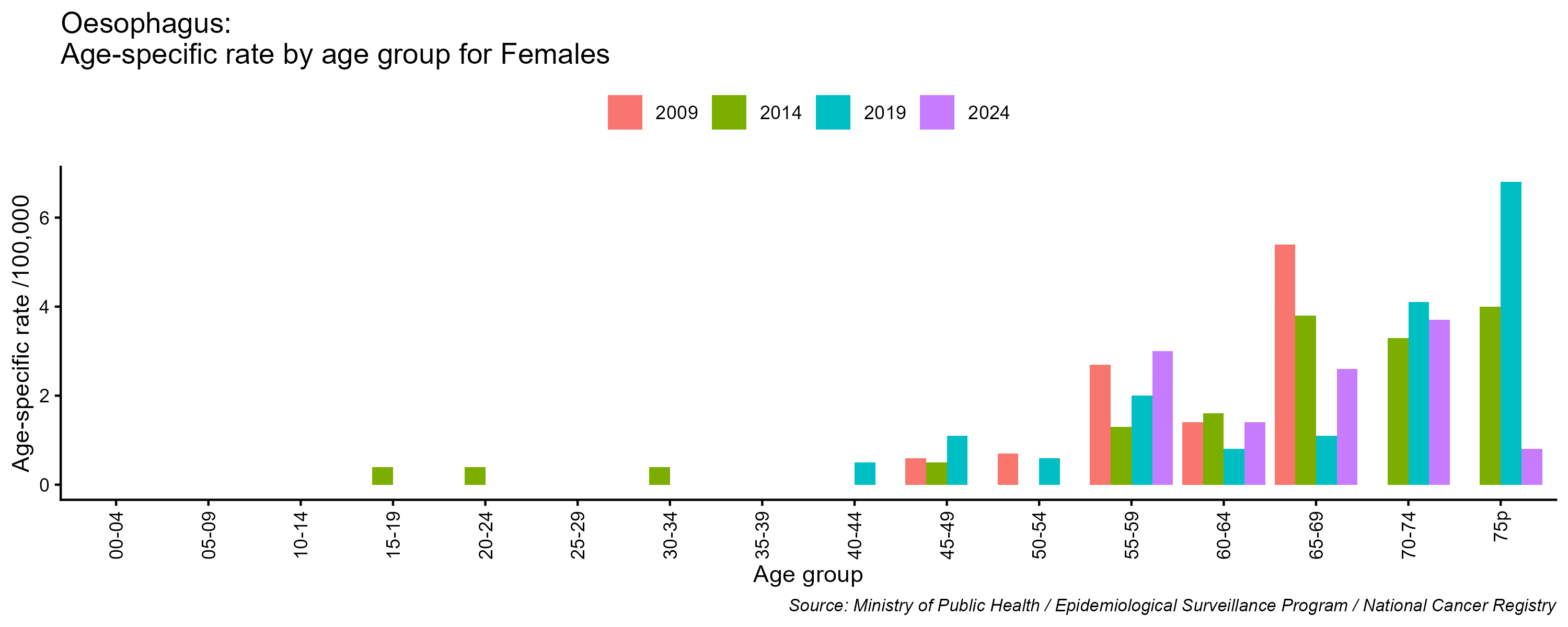 - Oesophagus cancer age-specific incidence rates, females, Lebanon, 2009, 2014, 2019, 2024