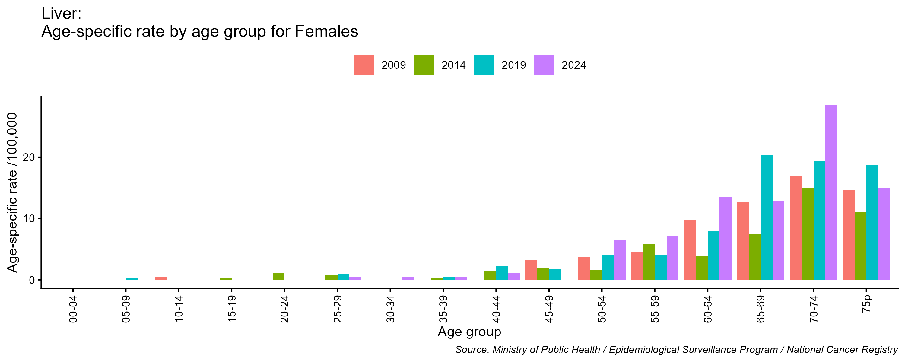 - Liver cancer age-specific incidence rates, females, Lebanon, 2009, 2014, 2019, 2024
