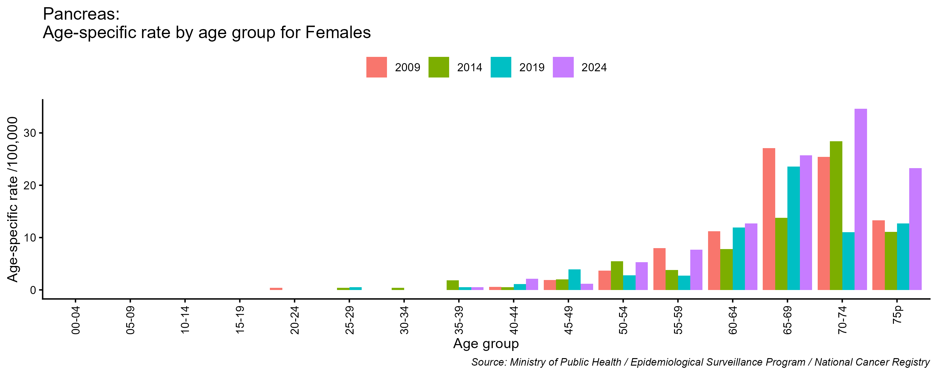 - Pancreas cancer age-specific incidence rates, females, Lebanon, 2009, 2014, 2019, 2024