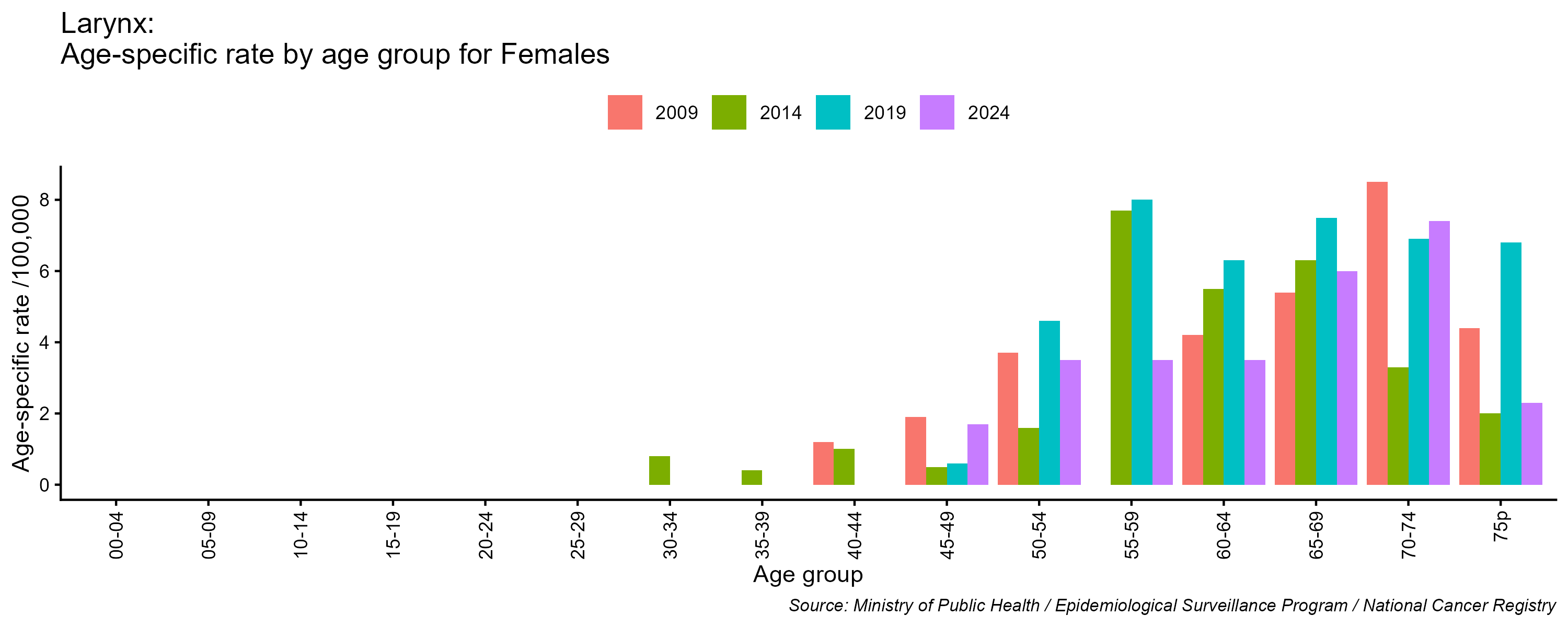 - Larynx cancer age-specific incidence rates, females, Lebanon, 2009, 2014, 2019, 2024