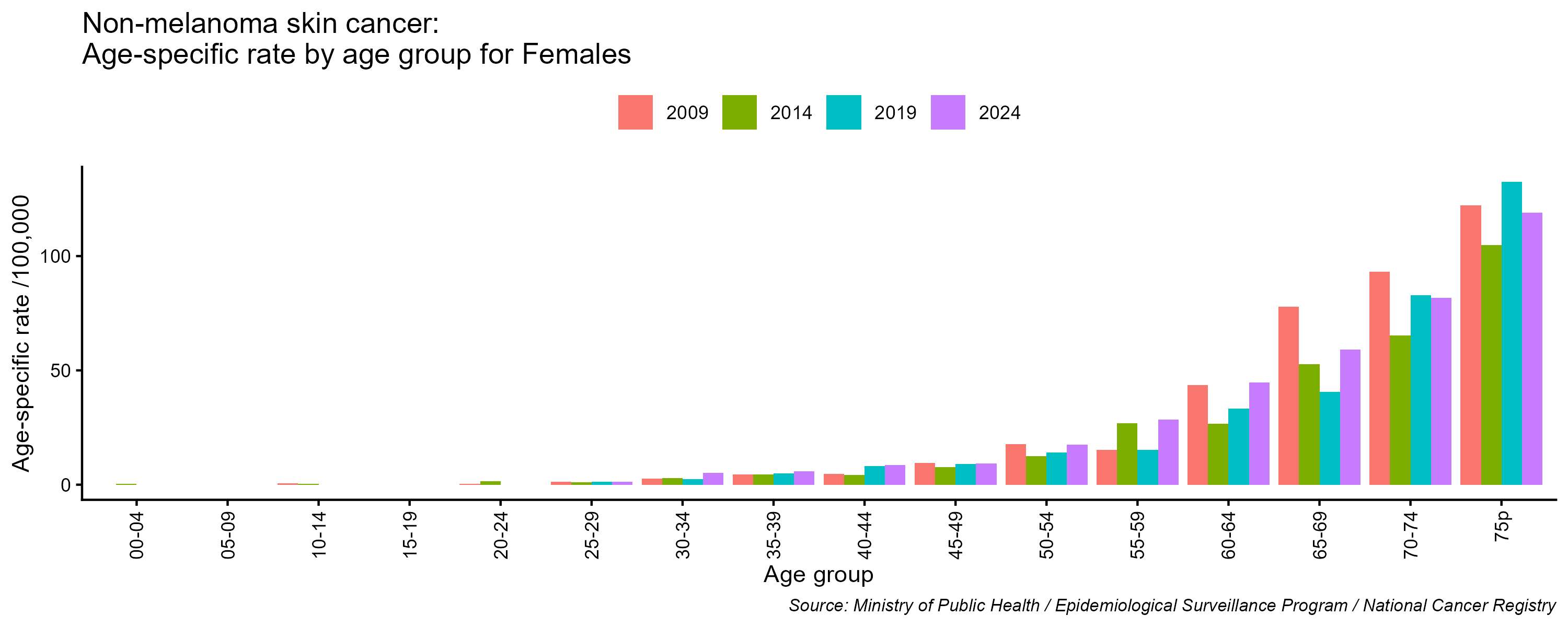 - Non-melanoma skin cancer age-specific incidence rates, females, Lebanon, 2009, 2014, 2019, 2024