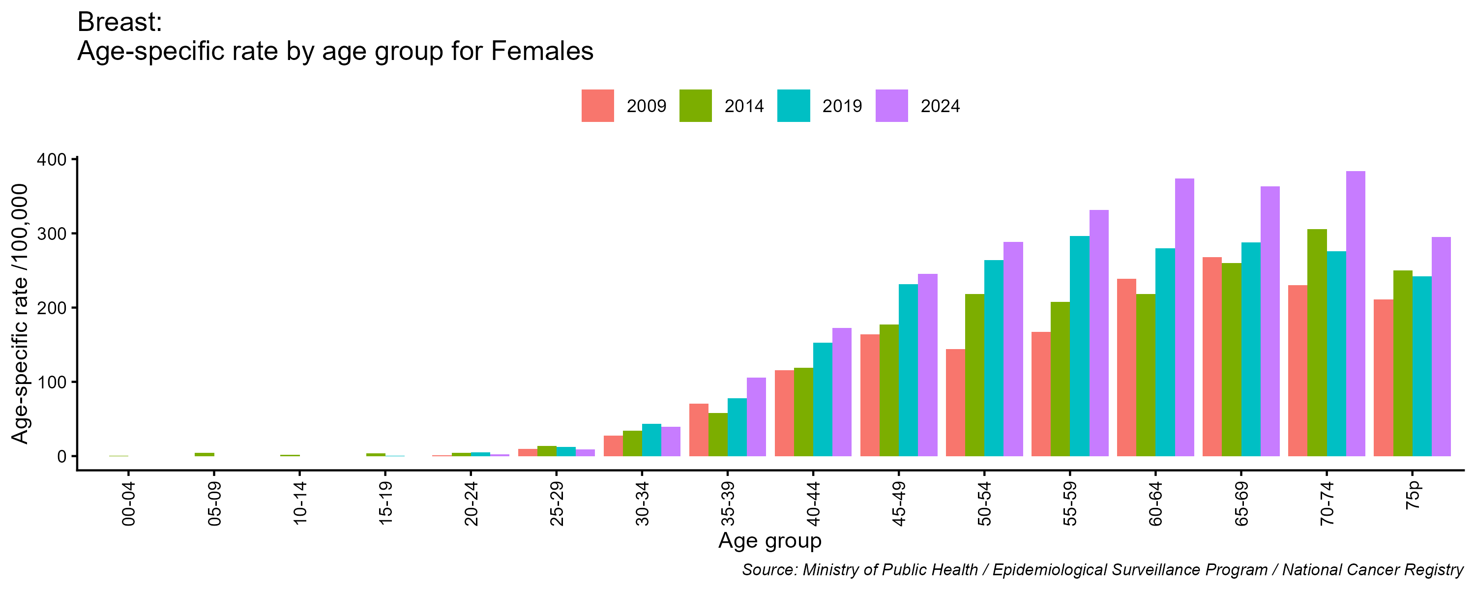 - Breast cancer age-specific incidence rates, females, Lebanon, 2009, 2014, 2019, 2024