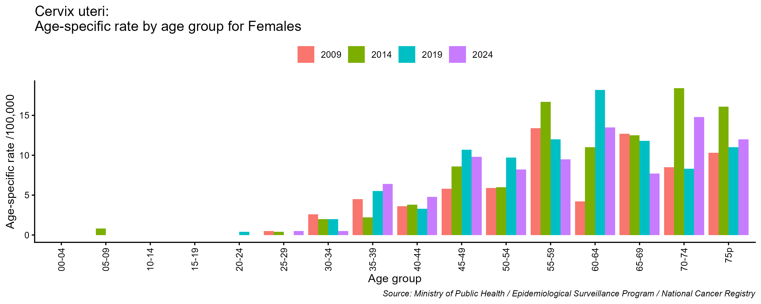 - Col uteri cancer age-specific incidence rates, females, Lebanon, 2009, 2014, 2019, 2024