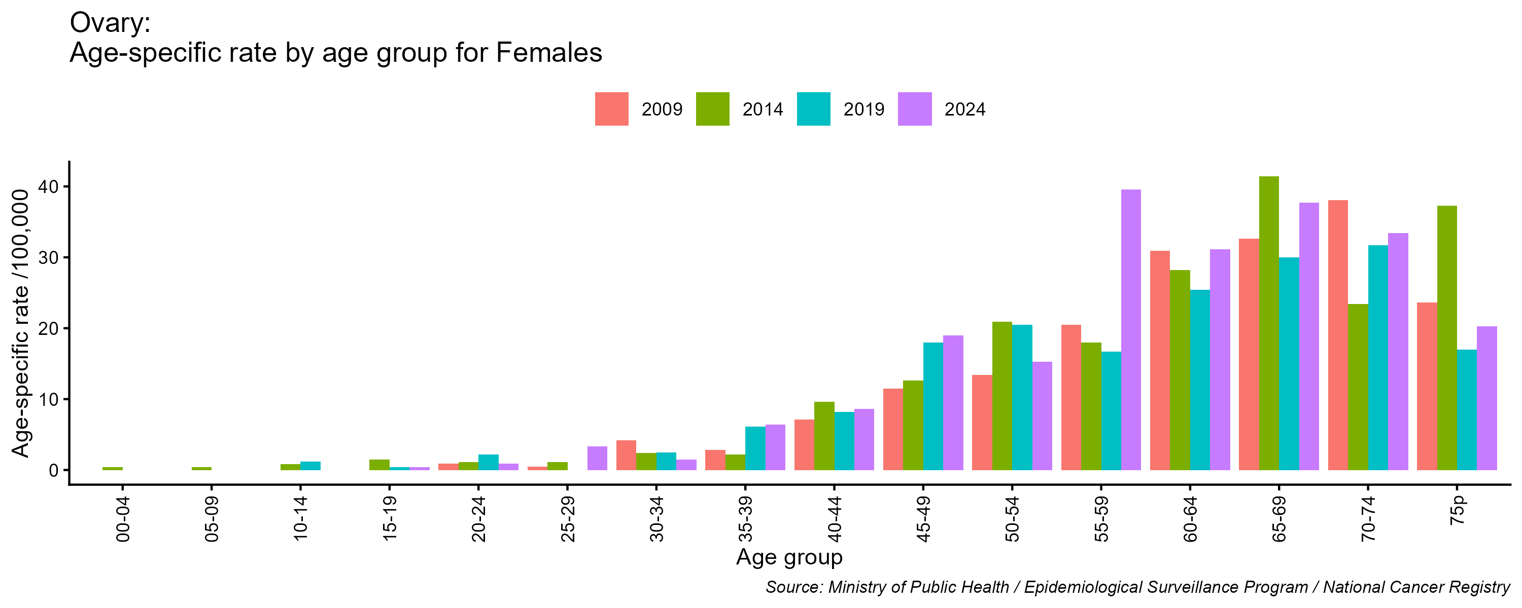 - Ovary cancer age-specific incidence rates, females, Lebanon, 2009, 2014, 2019, 2024