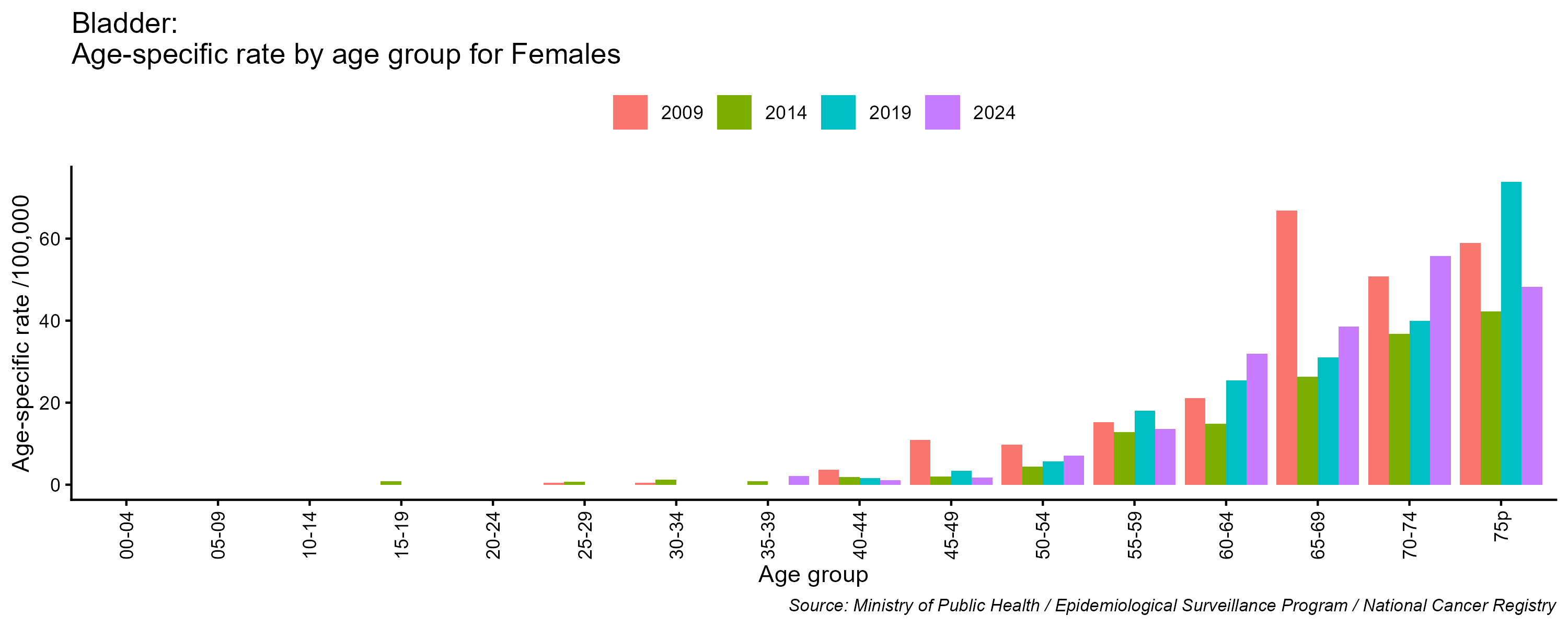 - Bladder cancer age-specific incidence rates, females, Lebanon, 2009, 2014, 2019, 2024