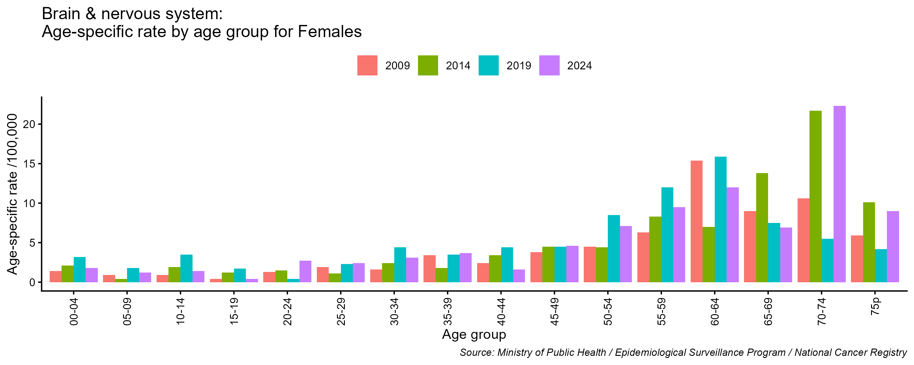 - Brain and central nervous system cancer age-specific incidence rates, females, Lebanon, 2009, 2014, 2019, 2024