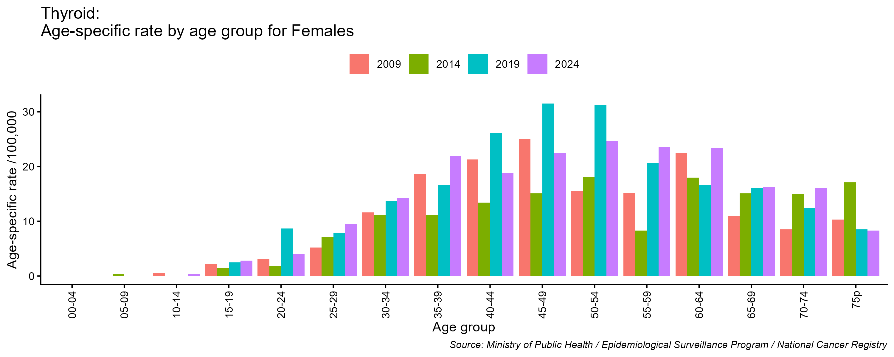 - Thyroid cancer age-specific incidence rates, females, Lebanon, 2009, 2014, 2019, 2024