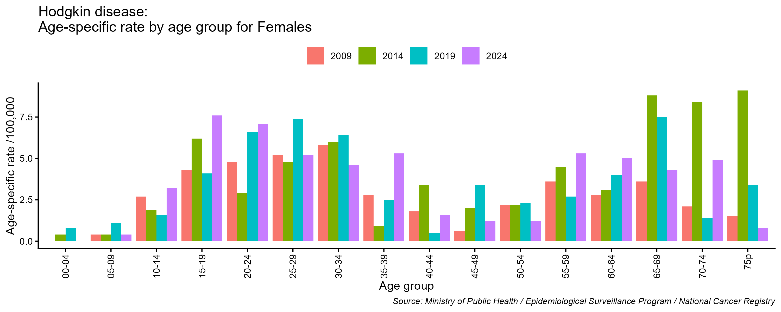 - Hodgkin's lymphoma age-specific incidence rates, females, Lebanon, 2009, 2014, 2019, 2024