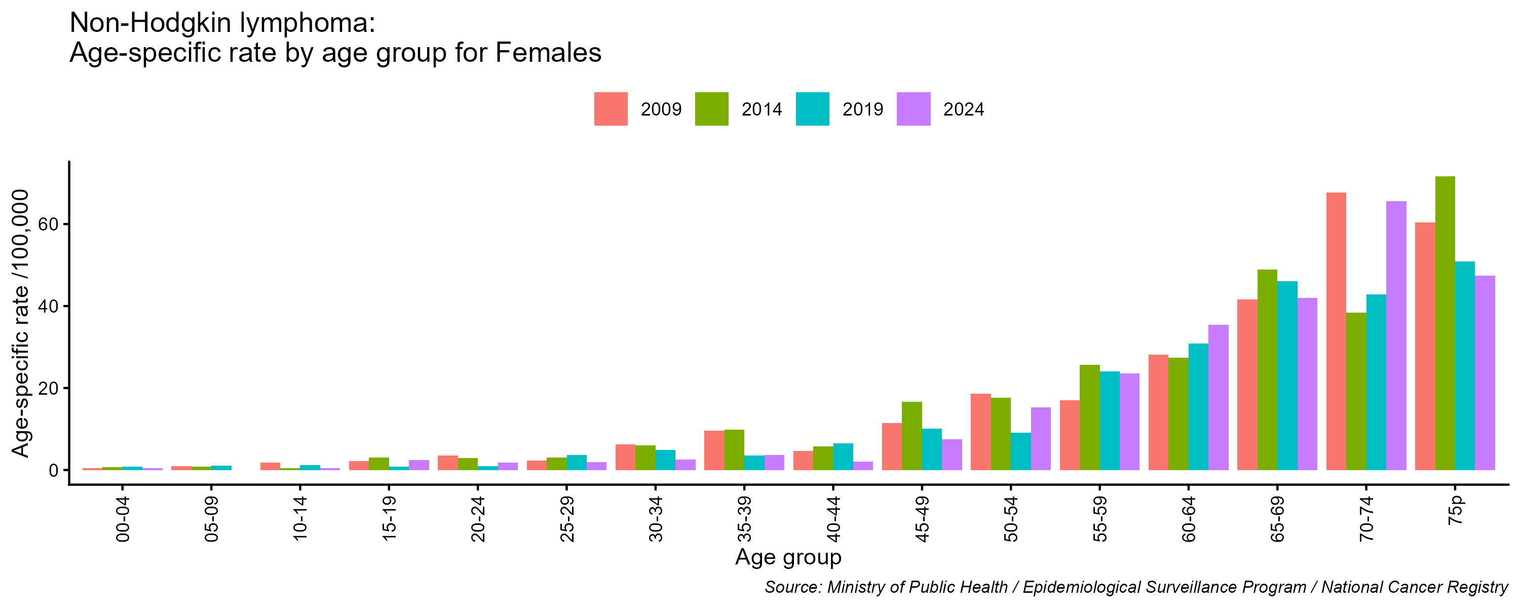 - Non-Hodgkin lymphoma age-specific incidence rates, females, Lebanon, 2009, 2014, 2019, 2024