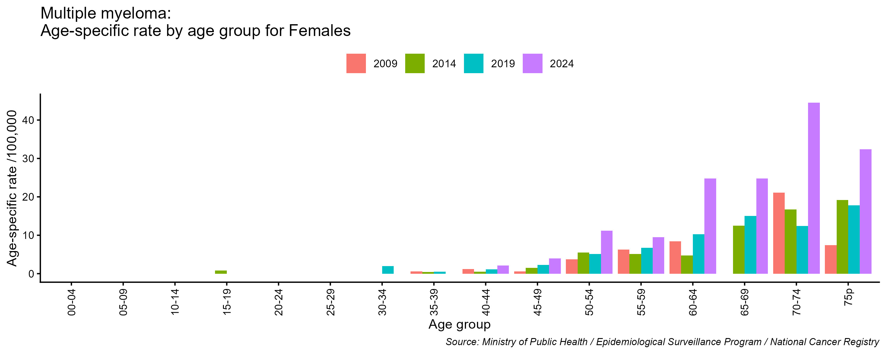 - Multiple Myeloma age-specific incidence rates, females, Lebanon, 2009, 2014, 2019, 2024