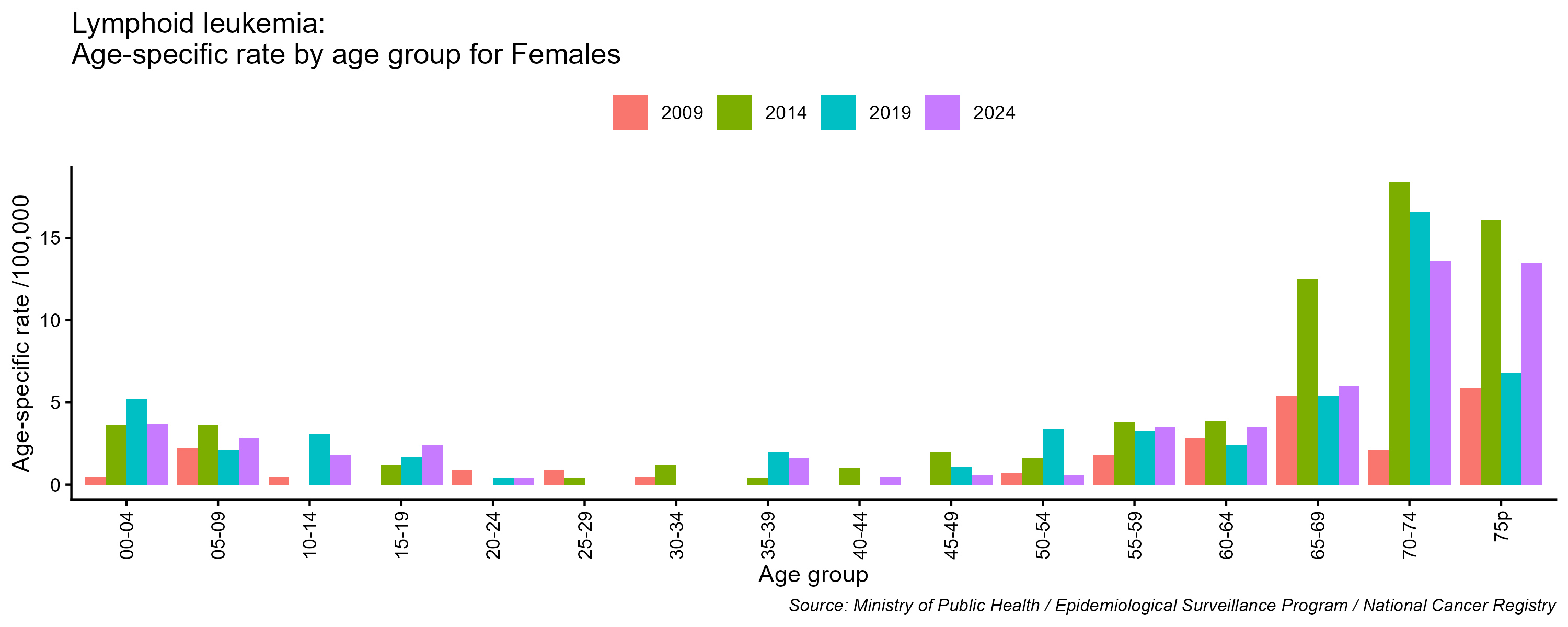 - Lymphoid leukemia age-specific incidence rates, females, Lebanon, 2009, 2014, 2019, 2024
