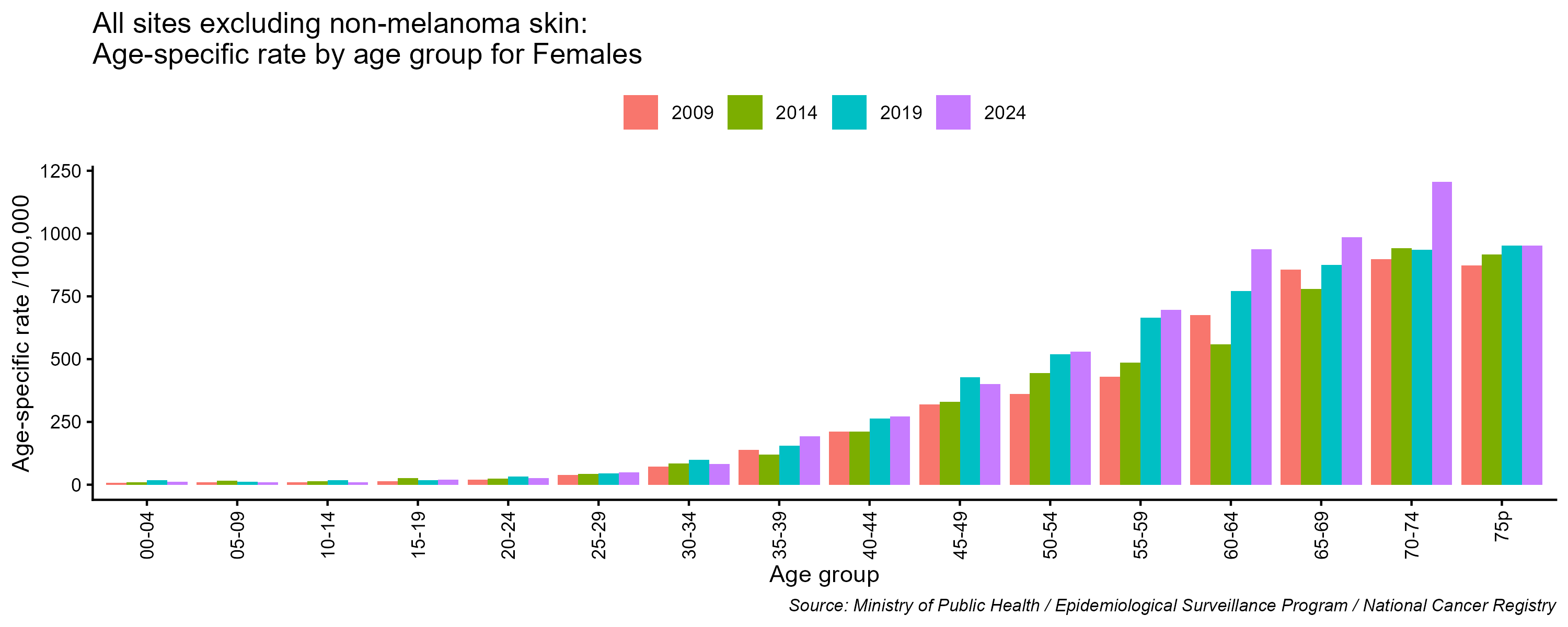 - All cancer age-specific incidence rates, excluding non-melanoma skin cancer, females, Lebanon, 2009, 2014, 2019, 2024