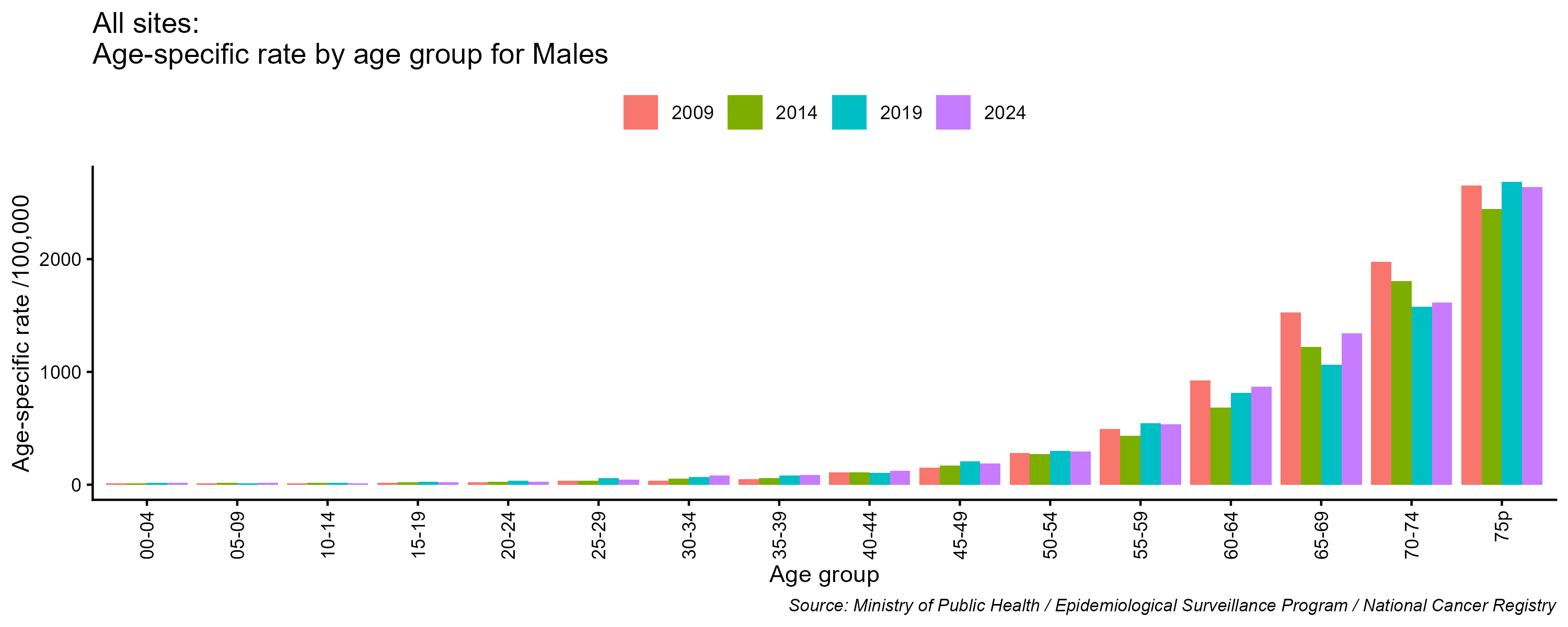 - All cancer age-specific incidence rates, including non-melanoma skin cancer, males, Lebanon, 2009, 2014, 2019, 2024
