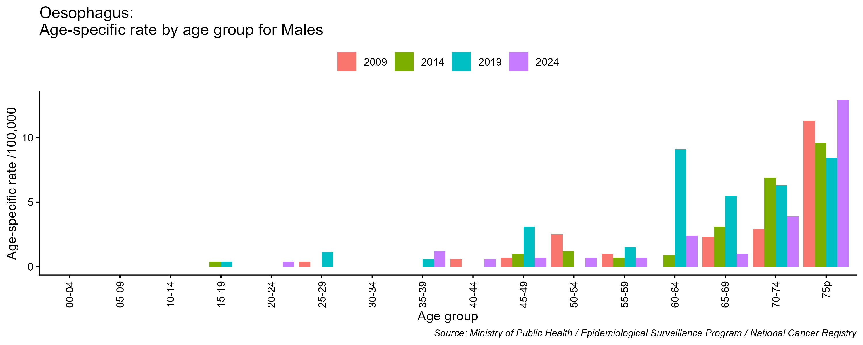 - Oesophagus cancer age-specific incidence rates, males, Lebanon, 2009, 2014, 2019, 2024
