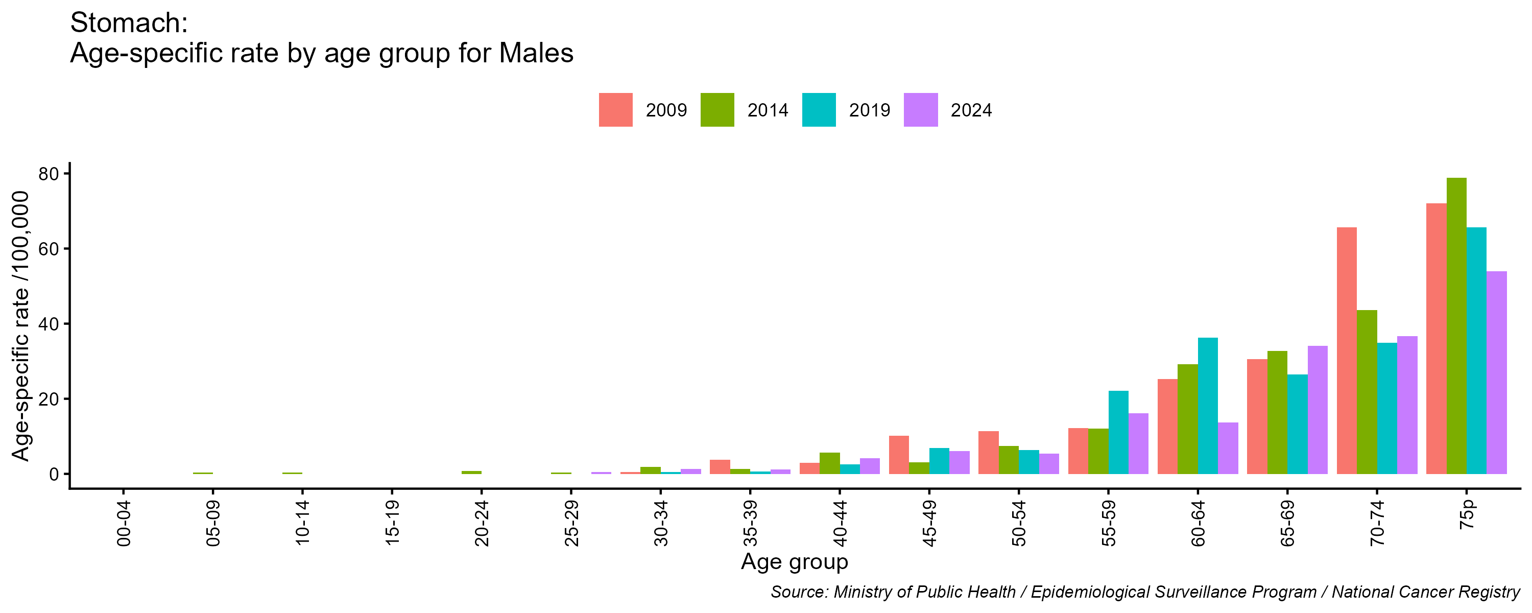 - Estomac cancer age-specific incidence rates, males, Lebanon, 2009, 2014, 2019, 2024
