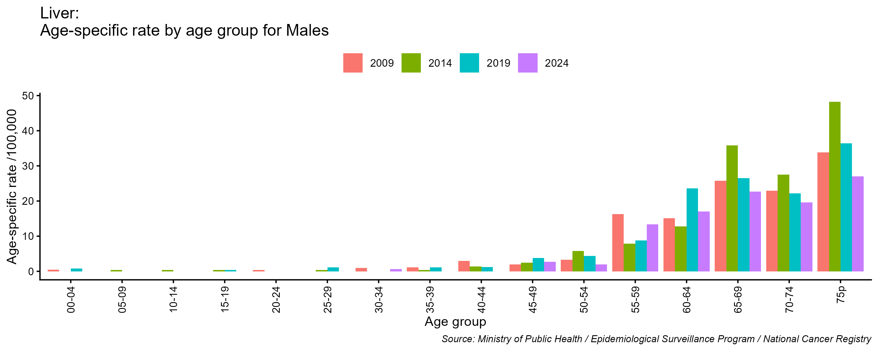 - Liver cancer age-specific incidence rates, males, Lebanon, 2009, 2014, 2019, 2024