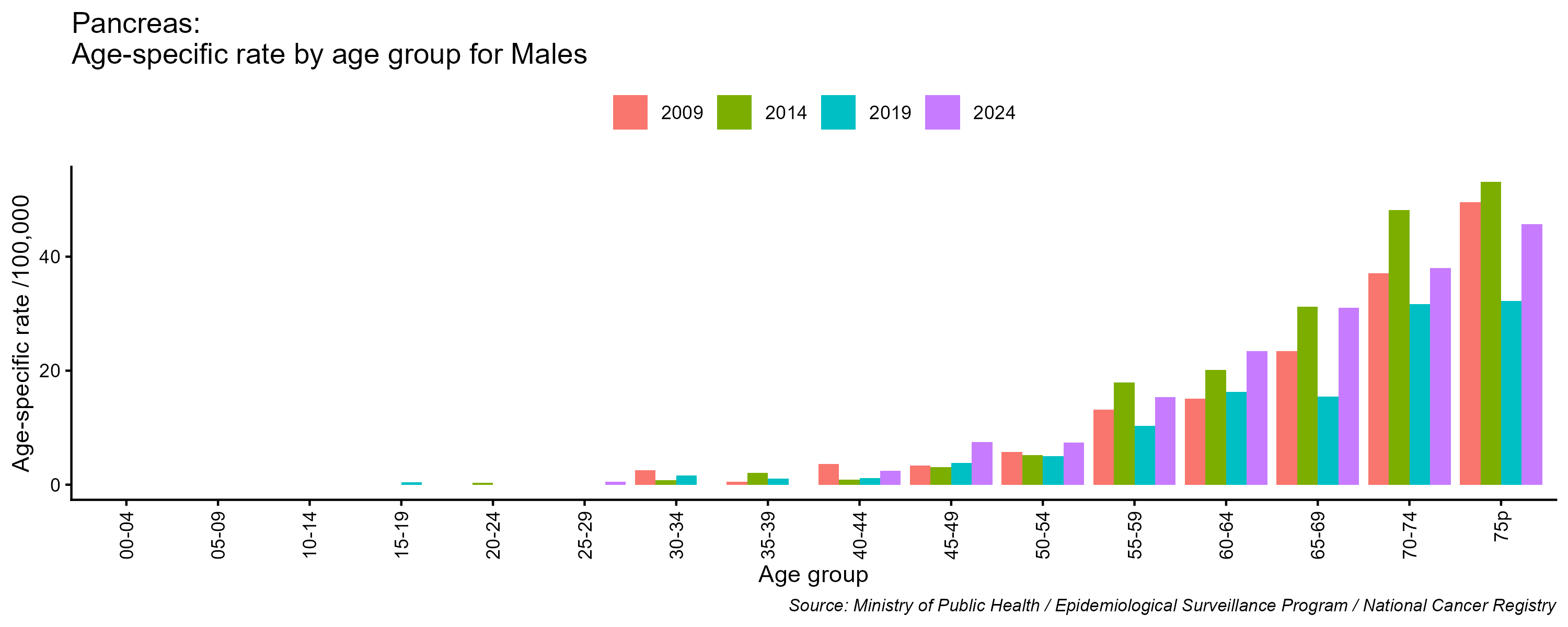 - Pancreas cancer age-specific incidence rates, males, Lebanon, 2009, 2014, 2019, 2024