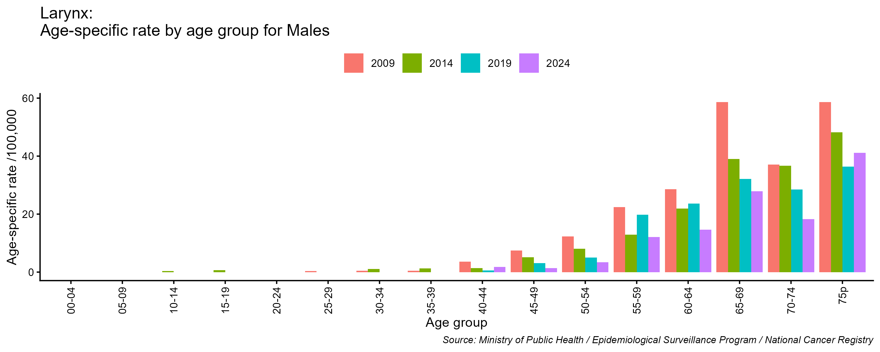 - Larynx cancer age-specific incidence rates, males, Lebanon, 2009, 2014, 2019, 2024