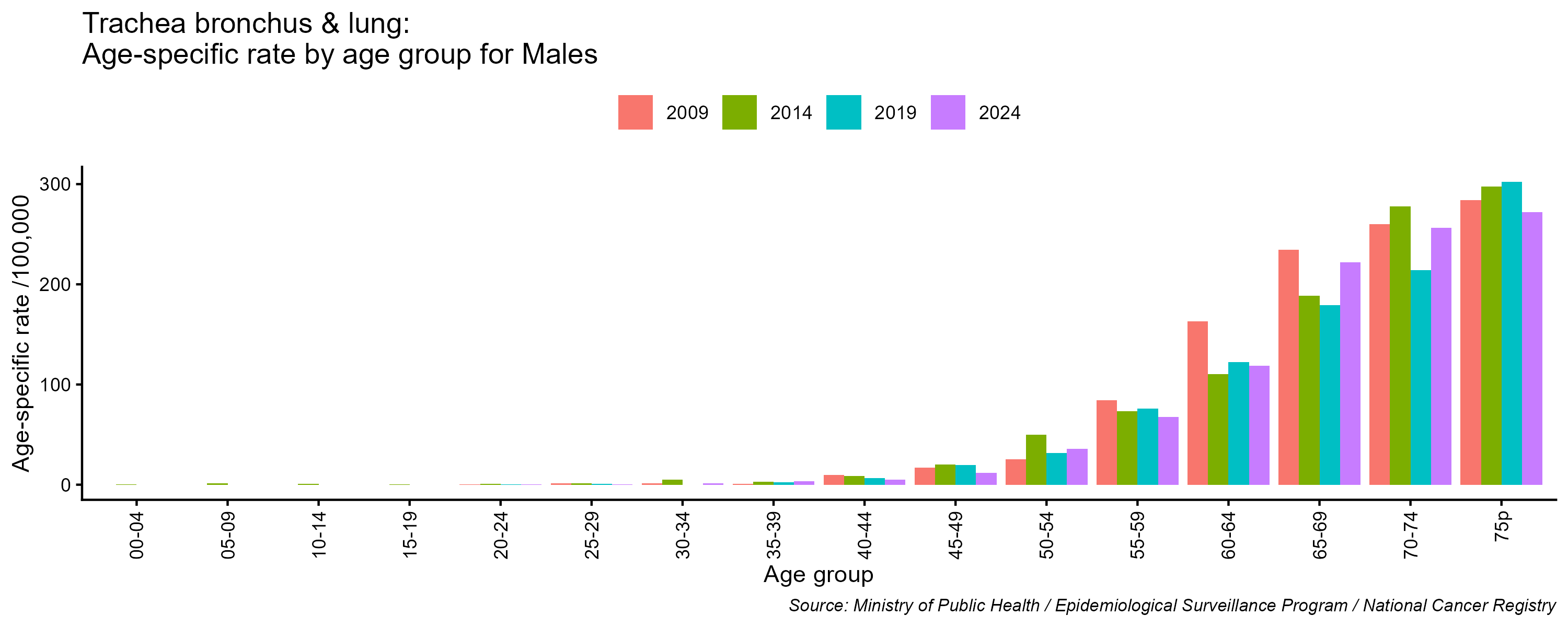 - Trachea-bronchus-lung cancer age-specific incidence rates, males, Lebanon, 2009, 2014, 2019, 2024