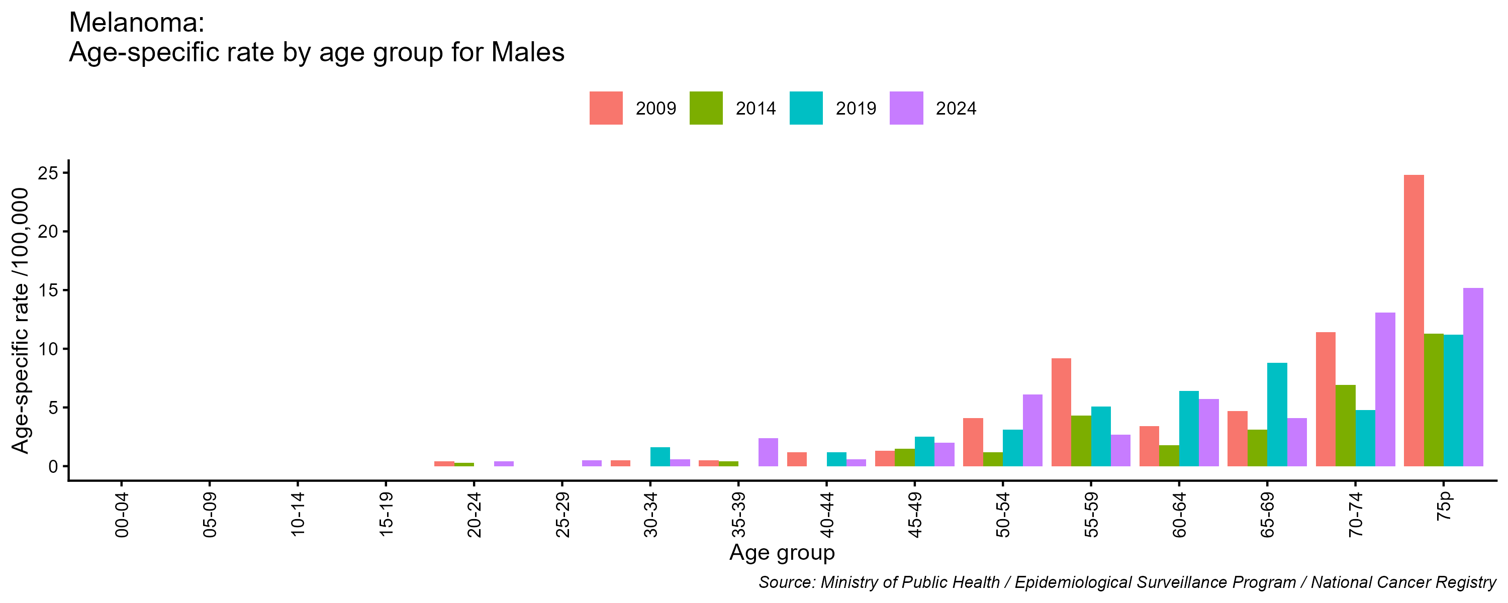 - Melanoma age-specific incidence rates, males, Lebanon, 2009, 2014, 2019, 2024