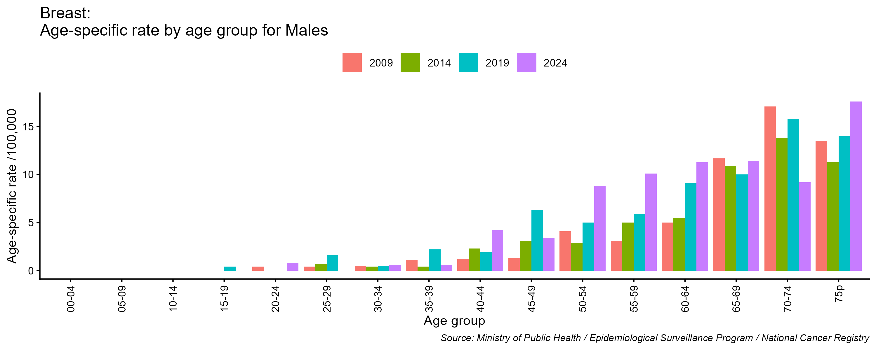 - Breast cancer age-specific incidence rates, males, Lebanon, 2009, 2014, 2019, 2024