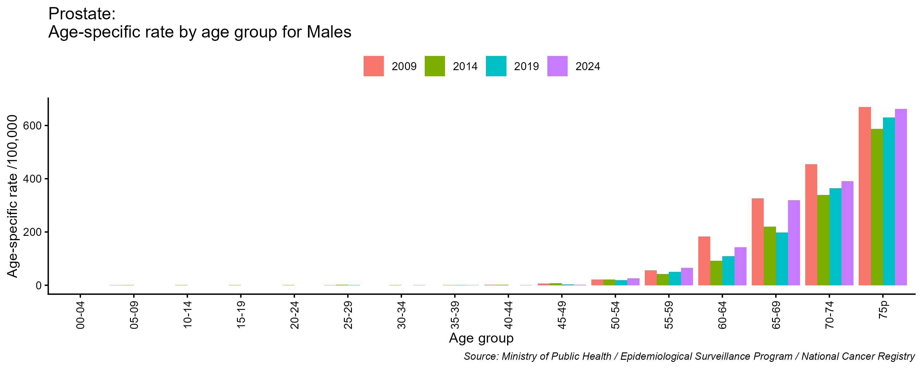 - Prostate cancer age-specific incidence rates, males, Lebanon, 2009, 2014, 2019, 2024