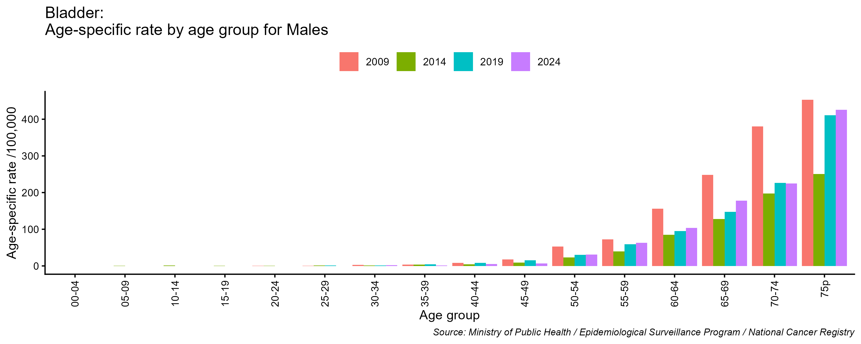 - Bladder cancer age-specific incidence rates, males, Lebanon, 2009, 2014, 2019, 2024