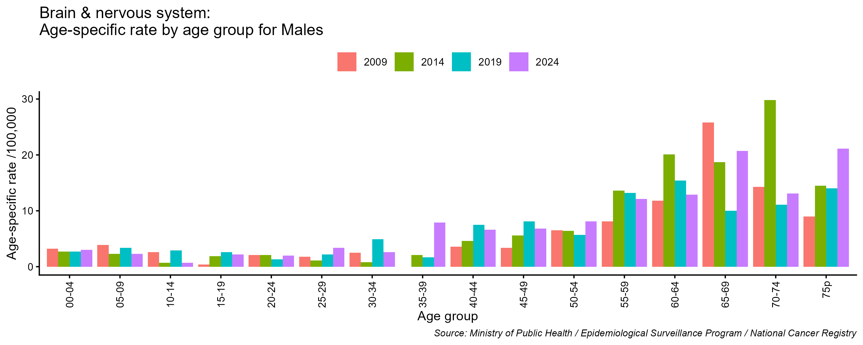 - Brain and central nervous system cancer age-specific incidence rates, males, Lebanon, 2009, 2014, 2019, 2024