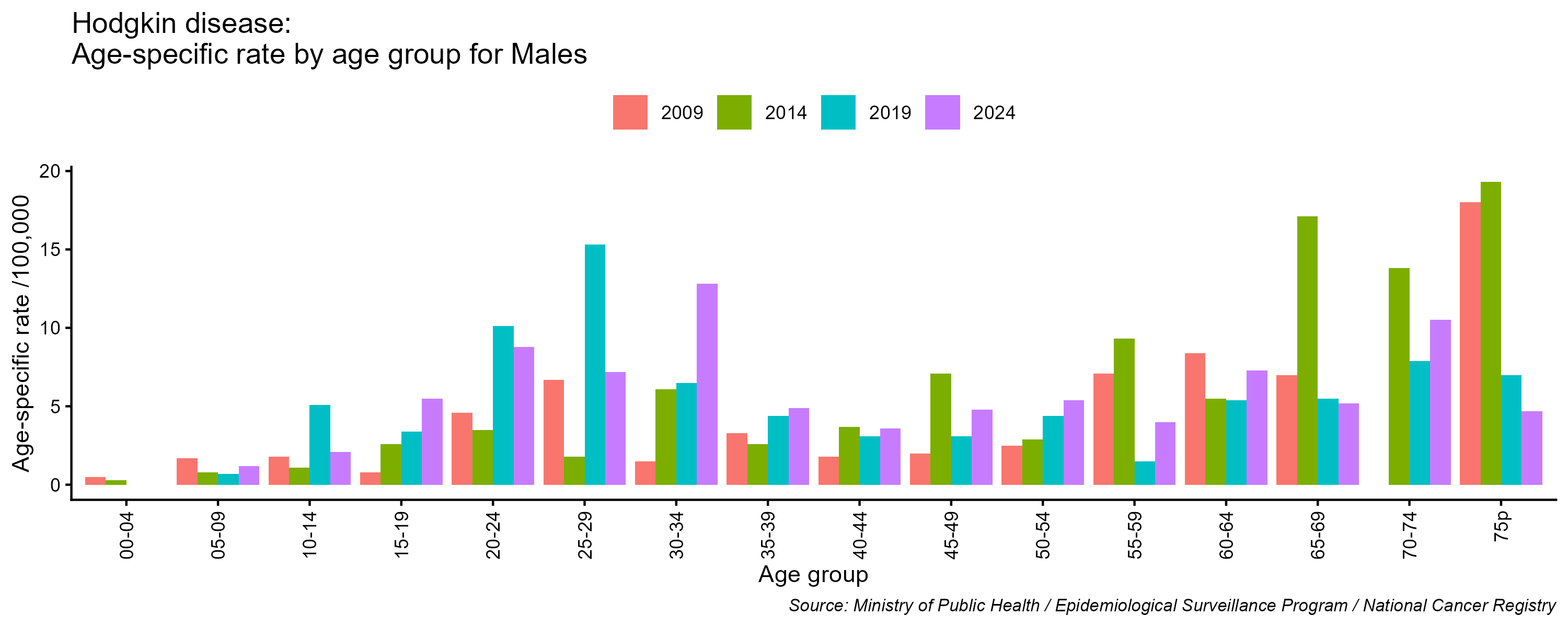 - Hodgkin's lymphoma age-specific incidence rates, males, Lebanon, 2009, 2014, 2019, 2024