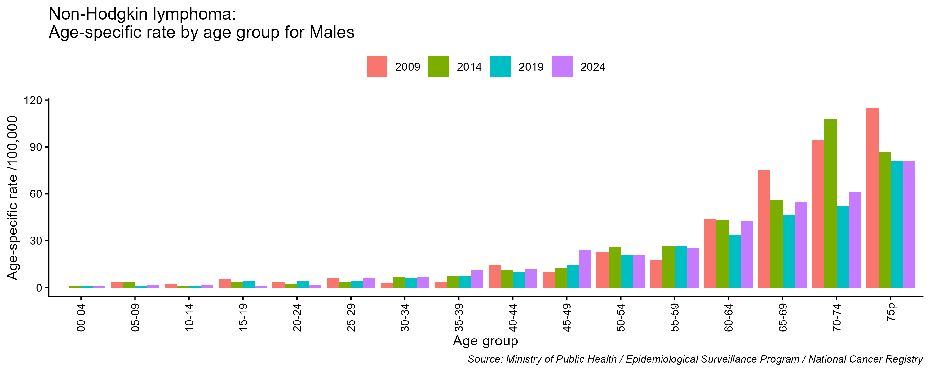 - Non-Hodgkin lymphoma age-specific incidence rates, males, Lebanon, 2009, 2014, 2019, 2024