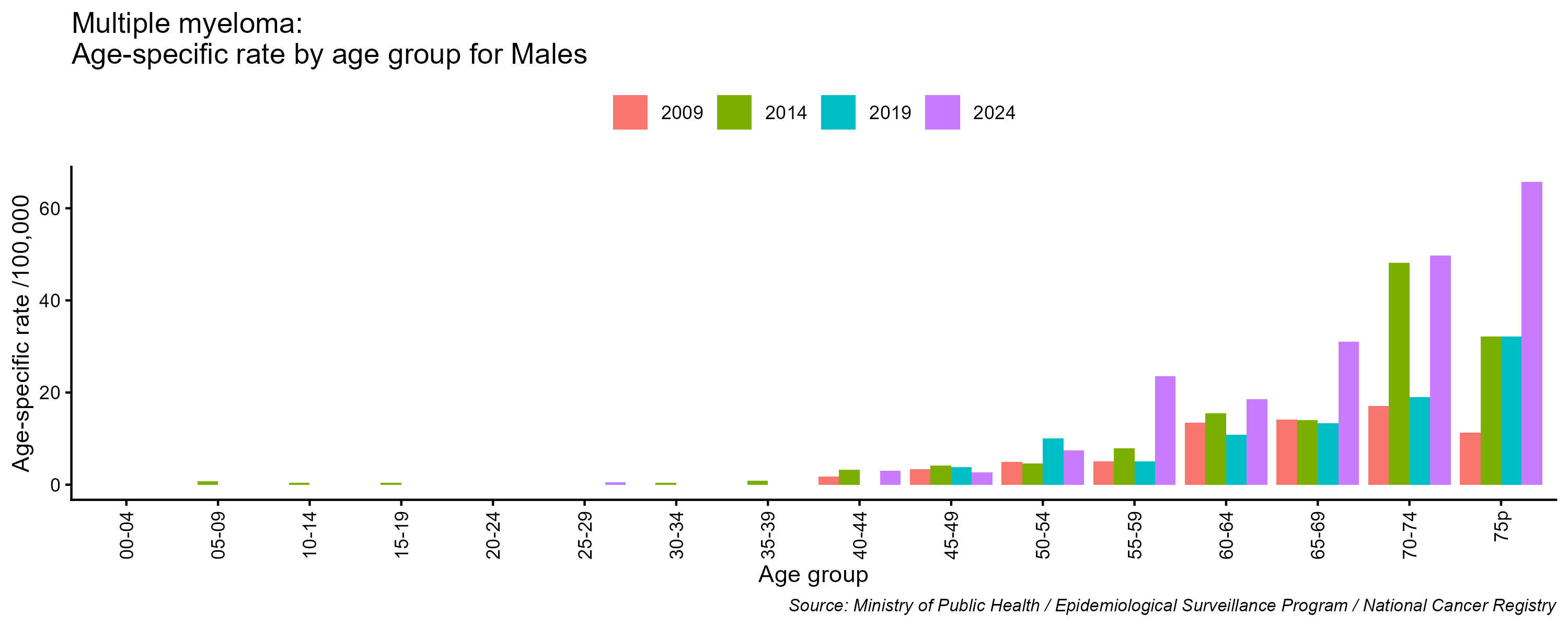 - Multiple Myeloma age-specific incidence rates, males, Lebanon, 2009, 2014, 2019, 2024