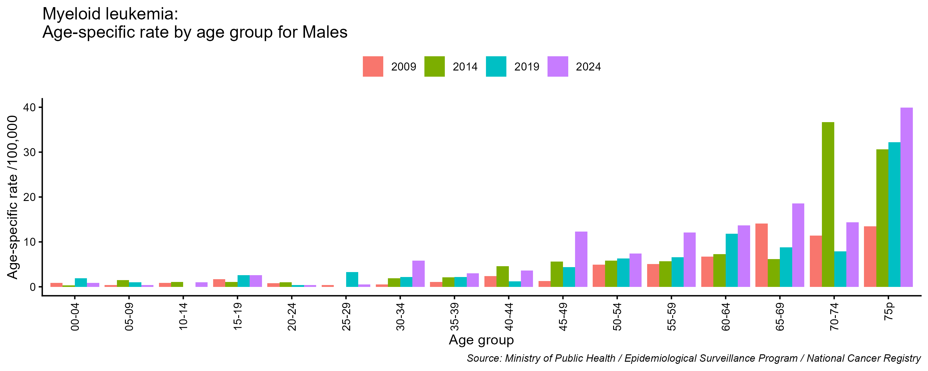 - Myeloid leukemia age-specific incidence rates, males, Lebanon, 2009, 2014, 2019, 2024