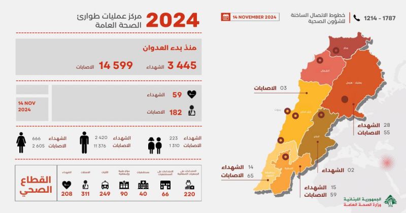 صدر عن مركز عمليات طوارئ الصحة العامة التابع لوزارة الصحة العامة التقرير اليومي لحصيلة وتداعيات العدوان الإسرائيلي على لبنان